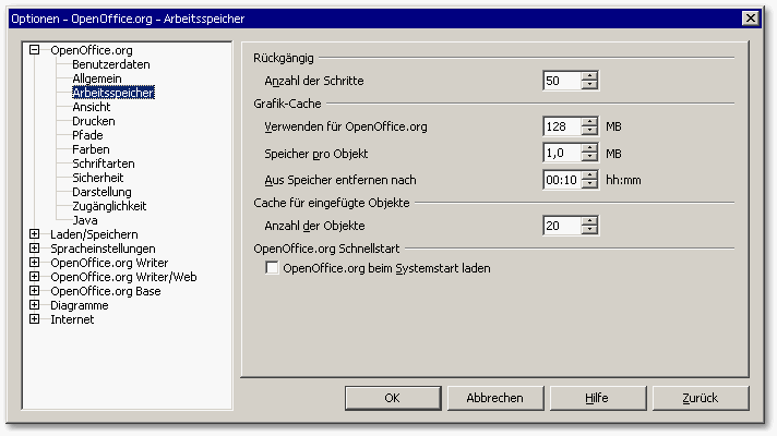 und stellt den möglichen zu verwendenden Arbeitsspeicher auf einen größeren Wert. Je höher der Wert ist, desto schneller startet OpenOffice.org.
