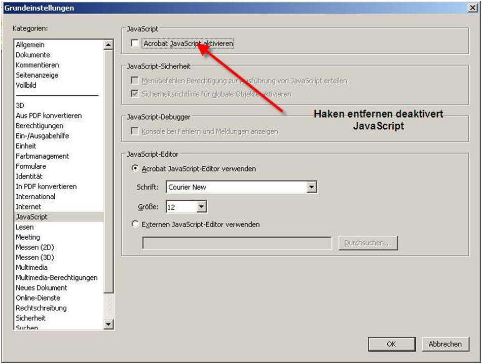 Um sich vor den kürzlich aufgedeckten Lücken im Acrobat Reader zu schützen, empfiehlt sich folgende Einstellung im Acrobat Reader: